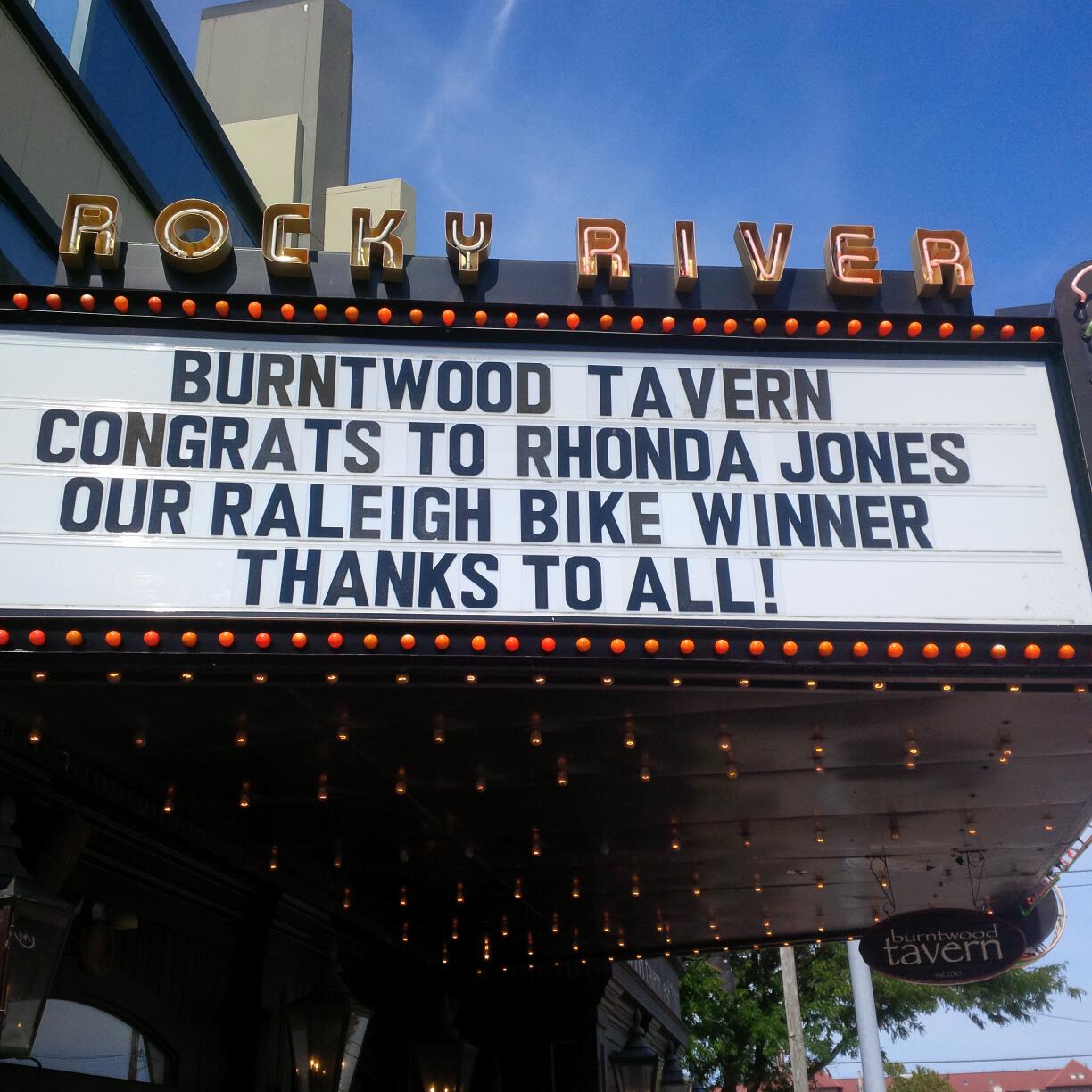 Patrons who rode their bicycles to The Burntwood Tavern of Rocky River on Wednesday nights, May 7 through August 13, enjoyed 15% off their bill, and a chance to win a Raleigh Misceo bike (valued at $600)!