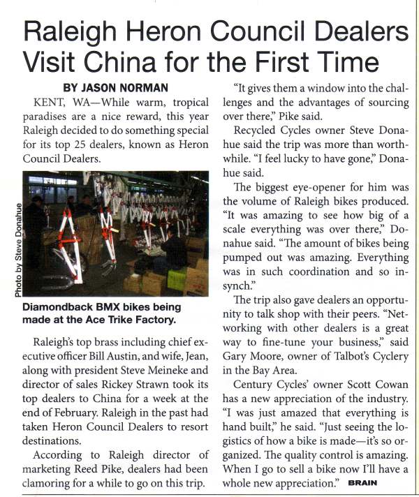 Raleigh's top brass including chief executive officer Bill Austin, and wife, Jean, along with president Steve Meineke and director of sales Rickey Strawn took its top dealers to China for a week at the end of February. Raleigh in the past had taken Heron Council Dealers to resort destinations.