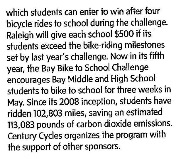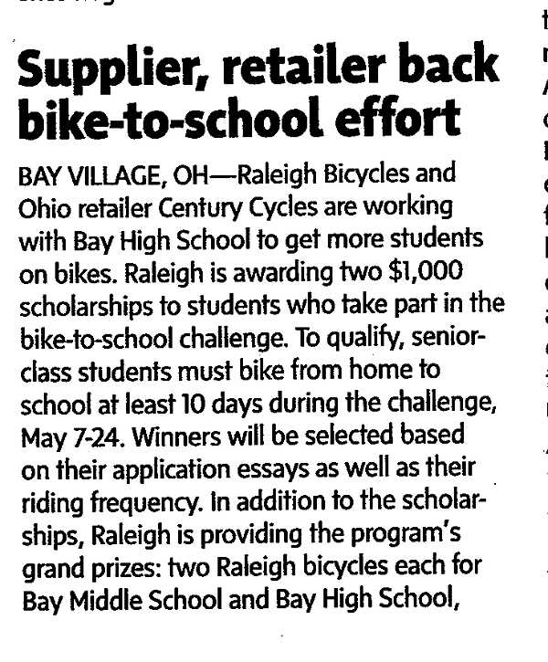 BAY VILLAGE, OH -- Raleigh Bicycles and Ohio retailer Century Cycles are working with Bay High School to get more students on bikes. Raleigh is awarding two $1,000 scholarships to students who take part in the bike-to-school challenge. To qualify, senior-class students must bike from home to school at least 10 days during the challenge, May 7-24. Winners will be selected based on their application essays as well as their riding frequency. In addition to the scholarships, Raleigh is providing the program's grand prizes: two Raleigh bicycles each for Bay Middle School and Bay High School, which students can enter to win after four bicycle rides to school during the challenge. Raleigh will give each school $500 if its students exceed the bike-riding milestones set by last year's challenge. Now in it fifth year, the Bay Bike to School Challenge encourages Bay Middle and High School students to bike to school for three weeks in May. Since its 2008 inception, students have ridden 102,803 miles, saving an estimated 113,083 pounds of carbon dioxide emissions. Century Cycles organizes the program with the support of other sponsors.