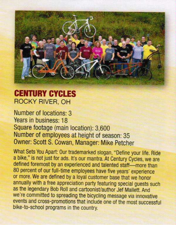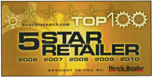 In its annual survey results published on Nov. 1, 2010, Bicycle Retailer and Industry News Magazine name Century Cycles on of the Top 100 Bicycle Retailers in the nation. We were honored with the additional distinction of being named a 5 Star Retailer for earning the Top 100 award for five or more consecutive years.