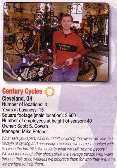 ![]() | Century Cycles What sets you apart: All of our staff including the owner are into the lifestyle of cycling and encourage everyone we come in contact with to join in the fun. We also cater to what we call "normal people." We feel that lots of other shops shun the average person who walks through their door, whereas we embrace them for who they are. And we are here to help them. |