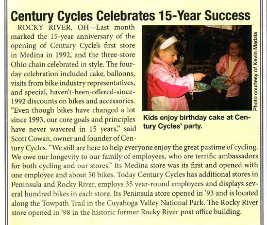 ROCKY RIVER, OH - Last month marked the 15-year anniversary of the opening of Century Cycle's first store in Medina in 1992, and the three-store Ohio chain celebrated in style. The four-day celebration included cake, balloons, visits from bike industry representatives, and special, haven't-been-offered-since-1992 discounts on bikes and accessories. "Even though bikes have changed a lot since 1993, our core goals and principles have never wavered in 15 years," said Scott Cowan, owner and founder of Century Cycles. "We still are here to help everyone enjoy the great pastime of cycling. We owe our longevity to our family of employees, who are terrific ambassadors for both cycling and our stores." Its Medina store was its first and opened with one employee and about 50 bikes. Today Century Cycles has additional stores in Peninsula and Rocky River, employs 35 year-round employees and displays several hundred bikes in each store. Its Peninsula store opened in '93 and is located along the Towpath Trail in the Cuyahoga Valley National Park. The Rocky River store opened in '98 in the historic Rocky River post office building.