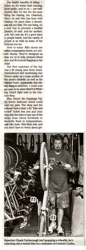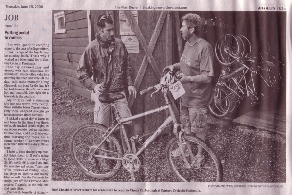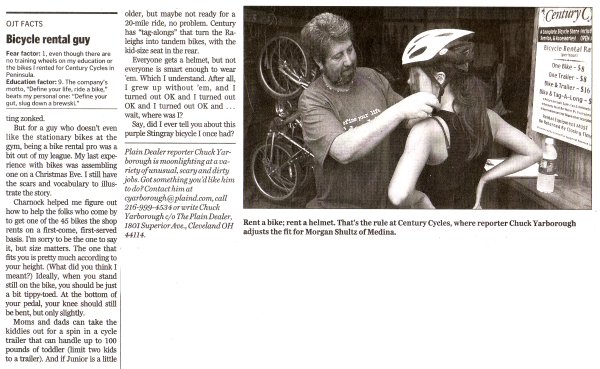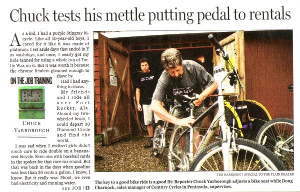 Chuck Yarborough of the Plain Dealer spent the day at our Peninsula store on June 14, 2008. Chuck's "On the Job Training" column is based on his experiences trying various unusual, scary, or dirty jobs in the Northeast Ohio region. On this day, he got his hands dirty as our Bicycle Rental Coordinator.