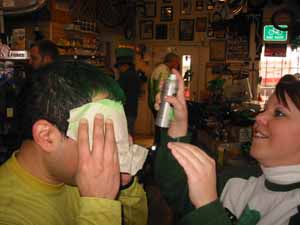 ![]() Julie helps Matt S get his hair colored for the occasion. |