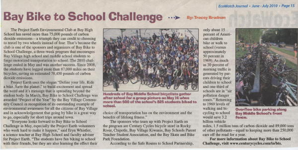 Project Earth uses the slogan "Define your life. Ride a bike. Save the planet." to build excitement and spread the word and its message that is spreading beyond the student body. In March, Bay Bike to School Challenge was awarded "Project of the Year" by Bay Village Community Council in recognition of its outstanding example of environmental awareness for all the citizens of Bay Village and in acknowledgement that going by bike is a great way to go, especially for short trips around town.