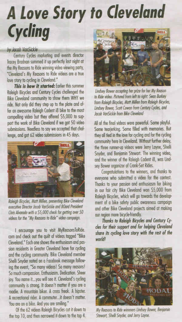 This is how it started: Earlier this summer Raleigh Bicycles and Century Cycles challenged the Bike Cleveland community to show them WHY we ride. Not only did they step up to the plate and offer an awesome Raleigh Cadent i8 bike to the most compelling video but they offered $5,000 to support the work of Bike Cleveland if we got 50 video submissions. Needless to say we accepted that challenge, and got 62 video submissions in 45 days.