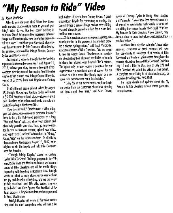 If 50 different people submit videos by August 15, Raleigh Bicycles and Century Cycles will make a $5,000 donation to local bicycle advocacy group Bike Cleveland to help them continue to promote and protect bicycling in Northeast Ohio.
