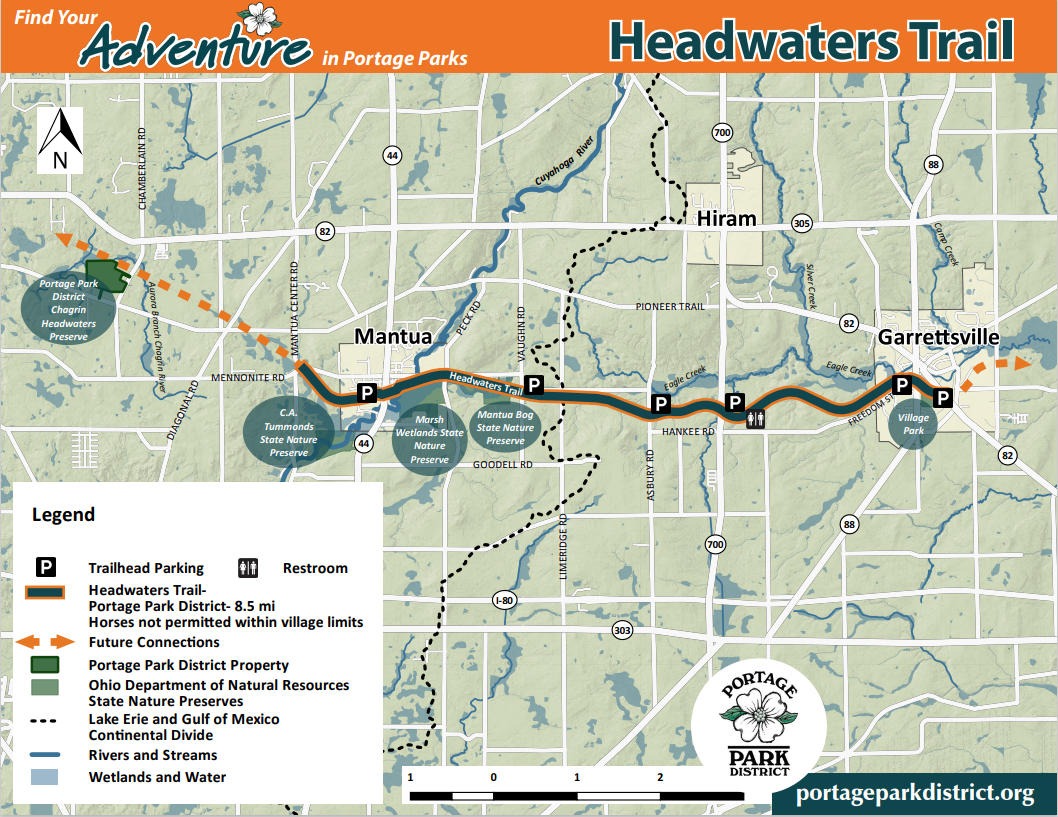 The Headwaters Trail, part of the Portage Park District, is a rail-trail that connects the villages of Mantua and Garrettsville. It is about 8.5 miles long, and follows the old Erie Lackawanna Railroad corridor. The surface is flat and composed of crushed limestone, suitable for most hybrid, mountain, and road bicycles.