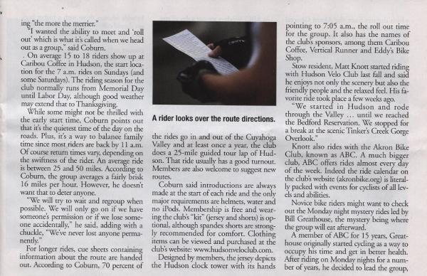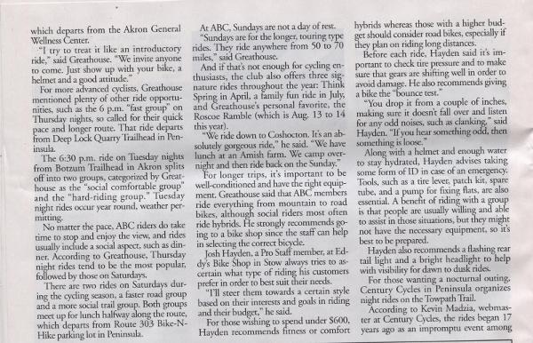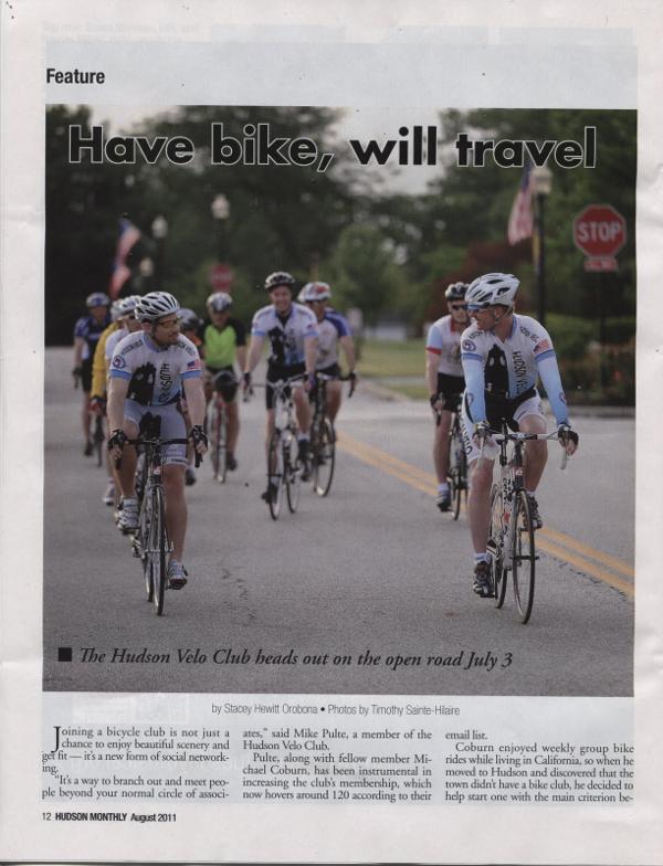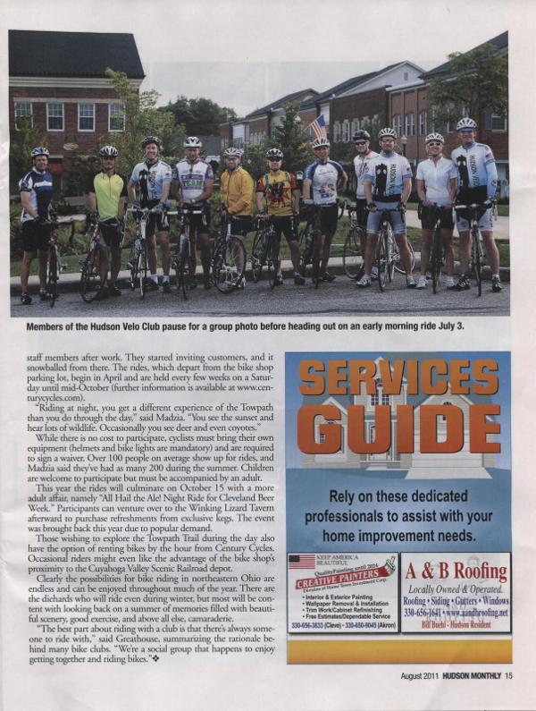 The August 2011 issue of Hudson Monthly magazine contained a feature article about the activities of area bicycling clubs, and also mentioned Century Cycles' Night Rides on the Towpath Trail and bicycle rental service. Scroll down below the images to read an excerpt.