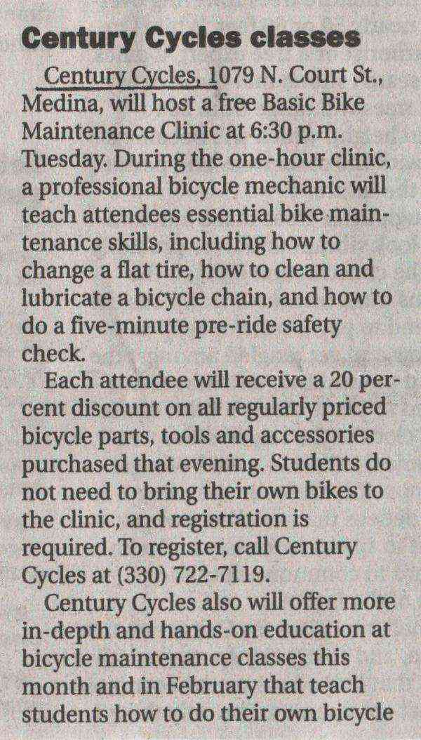 Thanks to the Medina Gazette for mentioning our Bicycle Maintenance Classes in the Jan. 5, 2011 edition: