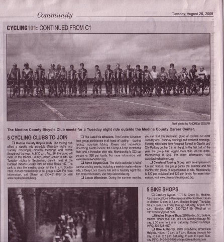 5 cycling clubs to joino Medina County Bicycle Club. The touring club offers a weekly ride schedule (Tuesday nights and Sunday mornings), monthly meetings and events throughout the year. At 6:30 p.m. Aug. 26, the group will meet at the Medina County Career Center to ride. On Tuesday nights in September, they’ll meet at the Buckeye Woods County Park on state Route 162. The park is also the meeting place for the 8 a.m. Sunday rides. Annual membership to the group is $20. For more information, call Shawn at 330-421-1987 or visit www.medinabikeclub.org.