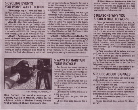 o Sept.1 — Ramble Around Medina: the fourth annual low budget century ride. This is a 100-mile unsupported ride around Medina and into northern Wayne County. The ride starts at Plaza 71 on state Route 18, just east of Interstate-71, then heads to Brunswick. It includes a rest stop in Liverpool Township, breakfast in Litchfield Township, ice cream in West Salem, a ride through the Cedar and Clear Creek valleys, followed by lunch in Lodi, more ice cream in Seville and Wadsworth, them back to the start. Bring money or food. Maps are provided, and helmets are required. INFO: Dave Polycn at 330-723-2831 or dave.polycn@medinabikeclub.org.