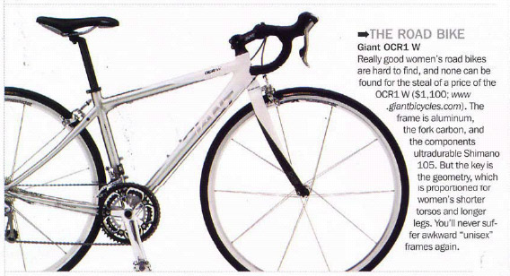 Giant OCR1 W - Really good women's road bikes are hard to find, and none can be found for the steal of a price of the OCR1 W ($1,100; www.giantbicycles.com). The frame is aluminum, the fork carbon, and the components ultradurable Shimano 105. But the key is the geometry, which is proportioned for women's shorter torsos and longer legs. You'll never suffer awkward "unisex" frames again.