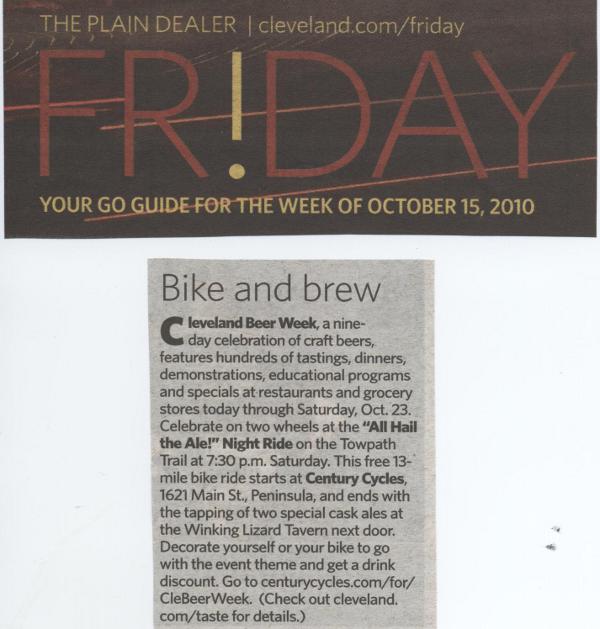 Cleveland Beer Week, a nine-day celebration of craft beers, features hundreds of tastings, dinners, demonstrations, educational programs and specials at restaurants and grocery stores today through Saturday, Oct. 23. Celebrate on two wheels at the "All Hail the Ale!" Night Ride on the Towpath Trail at 7:30 p.m. Saturday. This free 13-mile bike ride starts at Century Cycles, 1621 Main St., Peninsula, and ends with the tapping of two special casks ales at the Winking Lizard Tavern next door. Decorate yourself or your bike to go with the event theme and get a drink discount. Go to centurycycles.com/for/CleBeerWeek. (Check out cleveland.com/taste for details.)