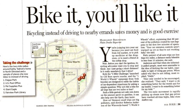 For details on taking short trips by bike, go to www.2milechallenge.com or to www.1world2wheels.org.