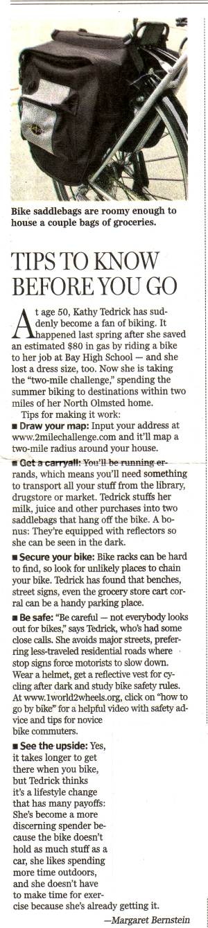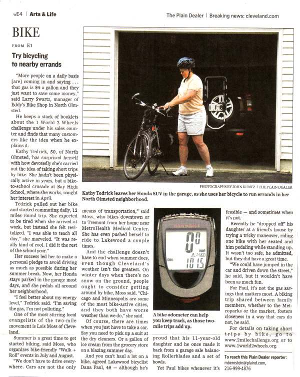 At age 50, Kathy Tedrick has suddenly become a fan of biking. It happened last spring after she saved an estimated $80 in gas by riding a bike to her job at Bay High School -- and she lost a dress size, too. Now she is taking the "two-mile challenge," spending the summer biking to destinations within two miles of her North Olmsted home.