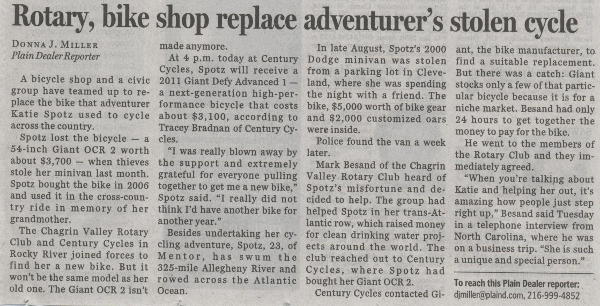 Mark Besand of the Chagrin Valley Rotary Club heard of Spotz's misfortune and decided to help. The group had helped Spotz in her trans-Atlantic row, which raised money for clean drinking water projects around the world. The club reached out to Century Cycles, where Spotz had bought her Giant OCR 2.