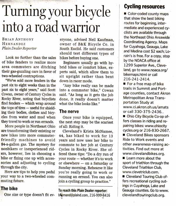 "We've sold more fenders in the past six to eight weeks than in the past six to eight years," said Scott Cowan, owner of Century Cycles in Rocky River, noting that bicyclists find fenders -- which wrap around the tops of tires -- useful for shielding their bodies, clothes and bicycles from water and mud when they travel to work or run errands.