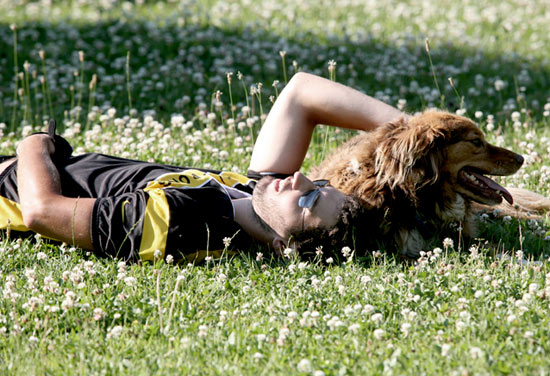 After Adam Rady arrives home Saturday evening, the first thing he did was drop to the ground and chill. The family dog 'Joe' who had missed him in the past couple of weeks, dropped down right beside him. After resting up a couple of days Adam and his dad Al will be back on the road to finish the cross country trip. (Shirley Ware, Photo Editor)