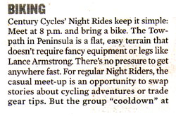 Century Cycles' Night Rides keep it simple: Meet at 8 p.m. and bring a bike. The Towpath in Peninsula is a flat, easy terrain that doesn't require fancy equipment or legs like Lance Armstrong. There's no pressure to get anywhere fast. For regular Night Riders, the casual meet-up is an opportunity to swap stories about cycling adventures or trade gear tips. But the group "cooldown" at Peninsula's Winking Lizard Tavern generates stories all its own. One employee remembers when a co-worker at the shop met his future wife at the Lizard. His first words to her were "Did you know your crank set is on recall?" Very casual.