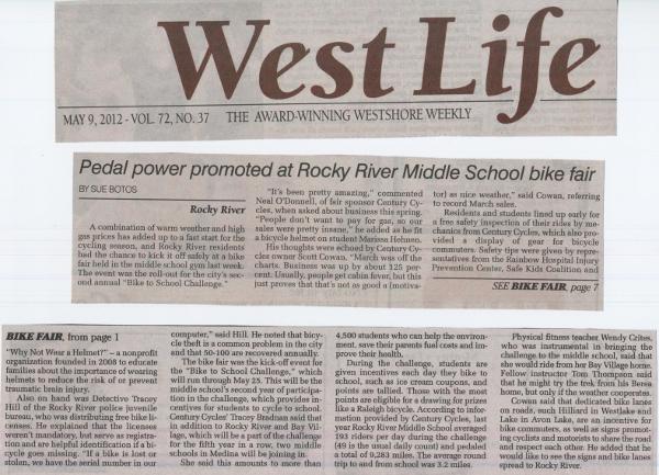 The bike fair was the kick-off event for the "Bike to School Challenge," which will run through May 25. This will be the middle school's second year of participation in the challenge, which provides incentives for students to cycle to school. Century Cycles' Tracey Bradnan said that in addition to Rocky River and Bay Village, which will be a part of the challenge for the fifth year in a row, two middle schools in Medina will be joining in.