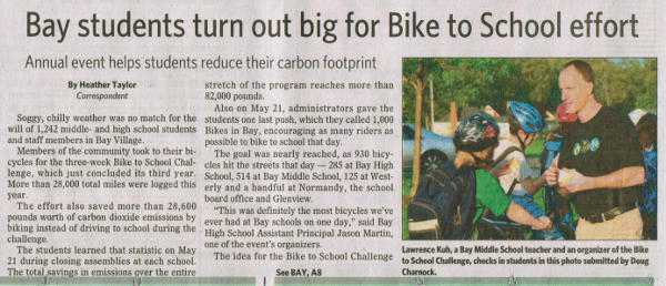 The idea for the Bike to School Challenge came a few years ago after a group of Bay High School students decided to ride their bikes to school for a day in protest of the high gas prices. They got more than 400 students on board.
