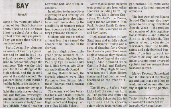 The last week of the Bike to School Challenge also happened to be during Cleveland Bicycle Week -- the product of a number of civic organizations' efforts -- and National Bike to Work Month. The groups set out to educate the workforce about the health, safety and neighborhood benefits of cycling to work instead of driving, and also to make drivers more aware of cyclists and encourage them to share the road.