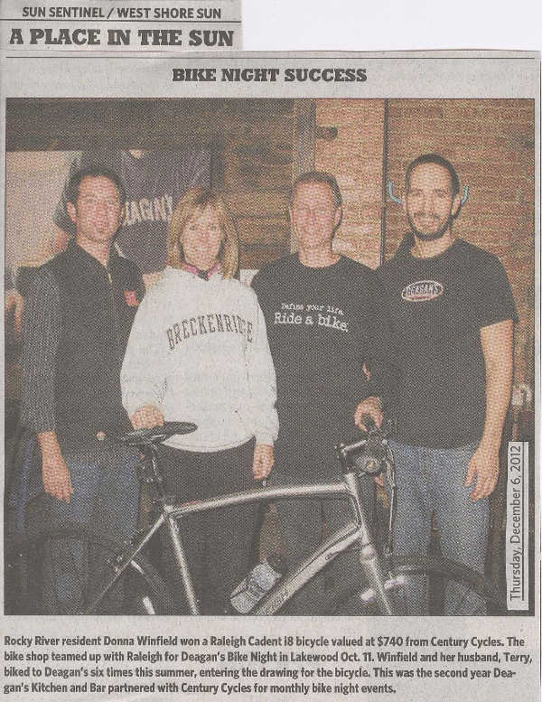 Rocky River resident Donna Whitfield won a Raleigh Cadent i8 bicycle valued at $740 from Century Cycles. The bike shop teamed up with Raleigh for Deagan's Bike Night in Lakewood Oct. 11. Whitfield and her husband, Terry, bike to Deagan's six times this summer, entering the drawing for the bicycle. This was the second year Deagan's Kitchen and Bar partnered with Century Cycles for monthly bike night events.