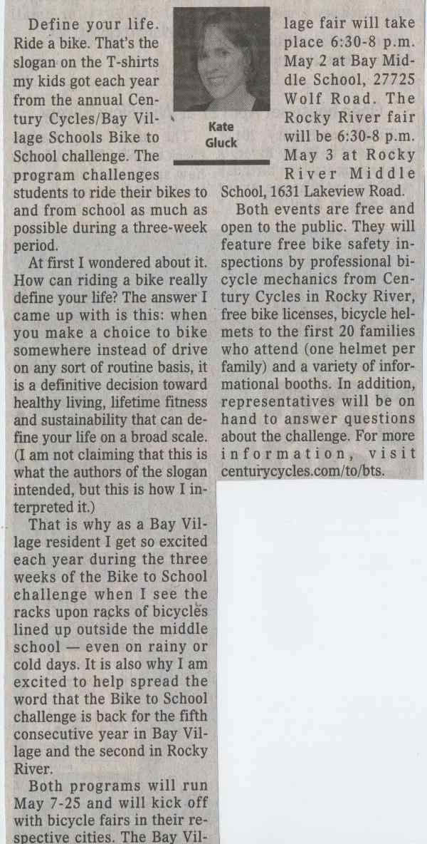 That is why as a Bay Village resident I get so excited each year during the three weeks of the Bike to School challenge when I see the racks upon racks of bicycles lined up outside the middle school -- even on rainy or cold days. It is also why I am excited to help spread the word that the Bike to School challenge is back for the fifth consecutive year in Bay Village and the second in Rocky River.