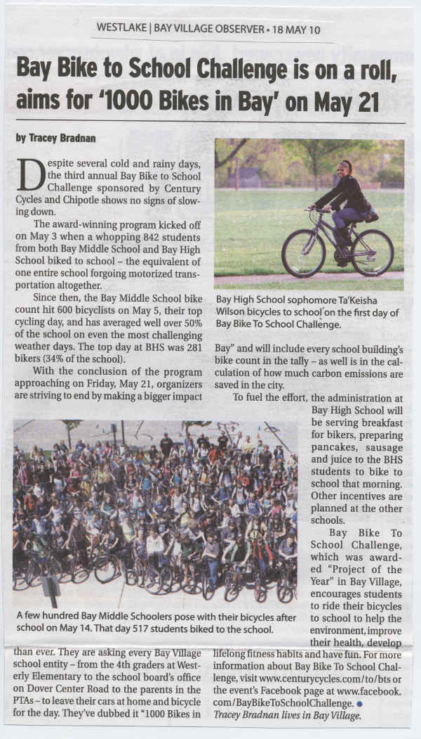 To fuel the effort, the administration at Bay High School will be serving breakfast for bikers, preparing pancakes, sausage and juice to the BHS students to bike to school that morning. Other incentives are planned at the other schools.Bay Bike To School Challenge, which was awarded "Project of the Year" in Bay Village, encourages students to ride their bicycles to school to help the environment, improve their health, develop lifelong fitness habits and have fun. For more information about Bay Bike To School Challenge, visit www.centurycycles.com/to/bts or the event's Facebook page at www.facebook.com/BayBikeToSchoolChallenge.