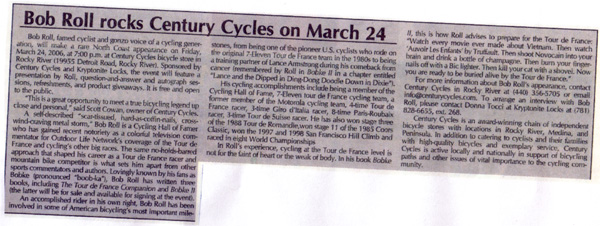 Bob Roll, famed cyclist and gonzo voice of a cycling generation, will make a rare North Coast appearance on Friday, March 24, 2006, at 7:00 p.m. at Century Cycles bicycle store in Rocky River (19955 Detroit Road, Rocky River). Sponsored by Century Cycles adn Kryptonite Locks, the event will feature a presentation by Roll, question-and-answer and autograph sessions, refreshments, and product giveaways. It is free and open to the public.
