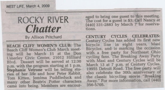 Century Cycles has added its first new bicycle line in eight years, Masi Bicycles, and is marking the occasion with a free party for Northeast Ohio cycling fans. The Breaking Away Party with Masi and Century Cycles will be March 13 at 7 p.m. at Century Cycles, 19955 Detroit Road. The free party will also celebrate teh 30th anniversary of the classic bicycling movie "Breaking Away." For more information, call (440) 356-5705.