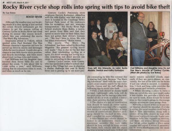 Century Cycle's owner, Scott [Cowan], who has sponsored a bike-to-school challenge in Bay Village last year, is planning a similar challenge this year in Rocky River and is gearing up to see more people commuting by bike this summer due to soarnig fuel costs. Because "Pee-Wee's Big Adventure" dealt with the main character's cross-country search for his stolen bicycle, [Cowan] and his staff offered the following tips to avoid bike theft: