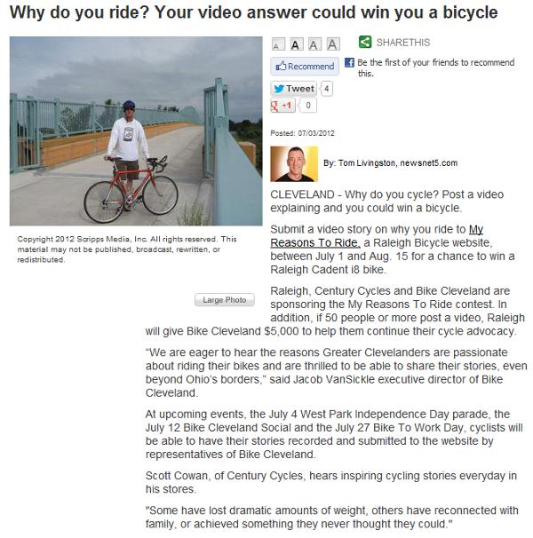Thanks to WEWS NewsNet 5 videographer Tom Livingston for metioning the My Reasons To Ride Cleveland Video Contest on the station's web site. You can read the full article here.